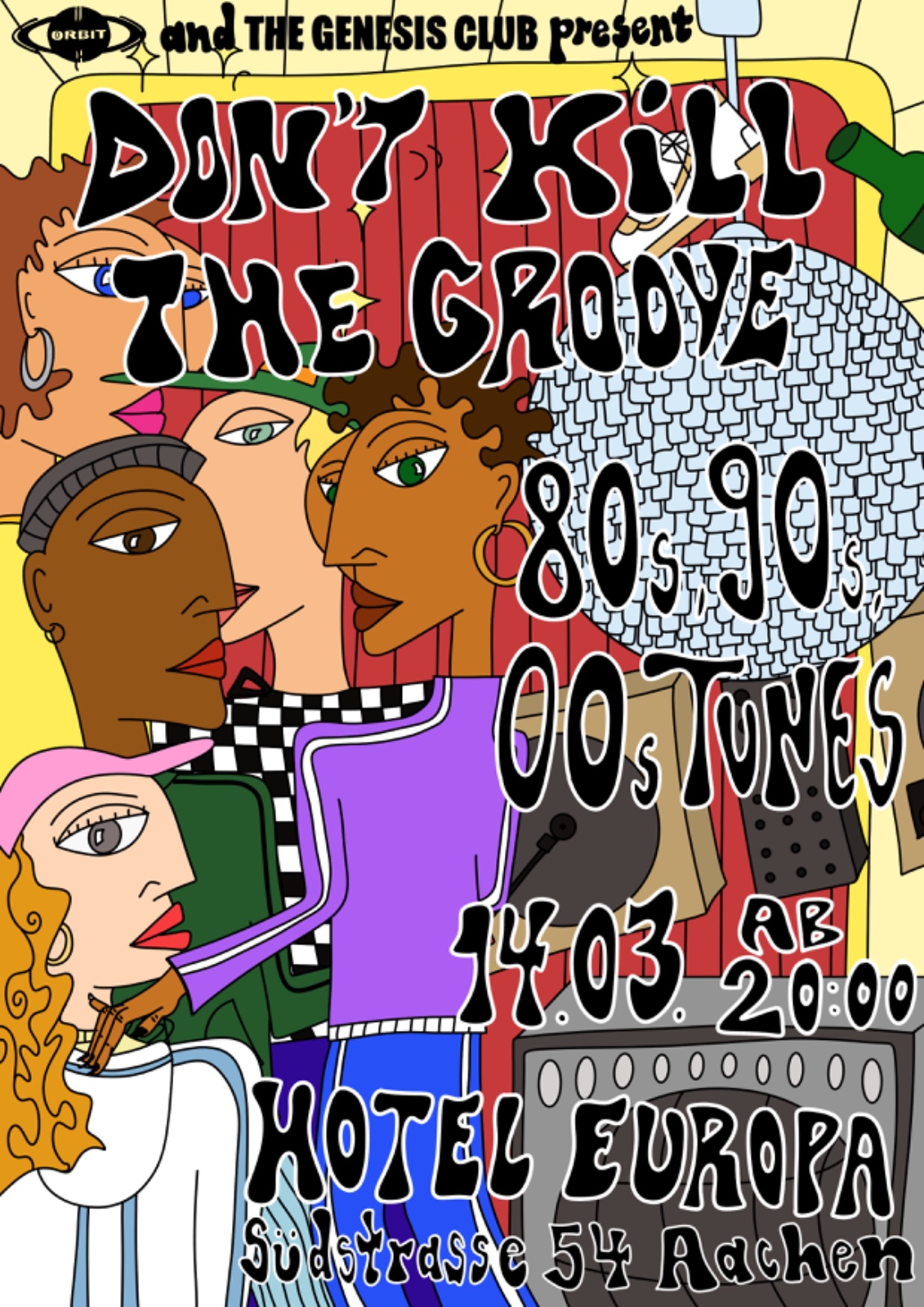 Don't kill the groove - heißt es am 14.03. im Hotel Europa. Brought to You by Orbit und The Genesis Club, wollen wir den Sound der 80er, 90er und 2000er zurück auf den Dancefloor bringen. Design by Uschi Underground